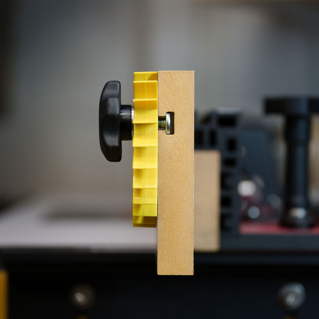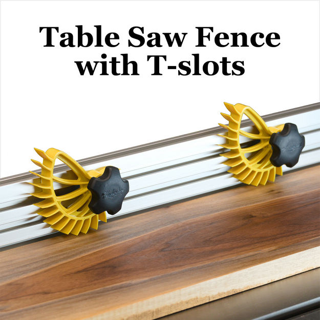 The Mini Hedgehog includes a 1/4-20 T-bolt that slides into a 1/2-inch T-sloton your table saw or router table fence. If your fence doesn’t have a T-slot, you can easily route one into a board and clamp that to your fence.